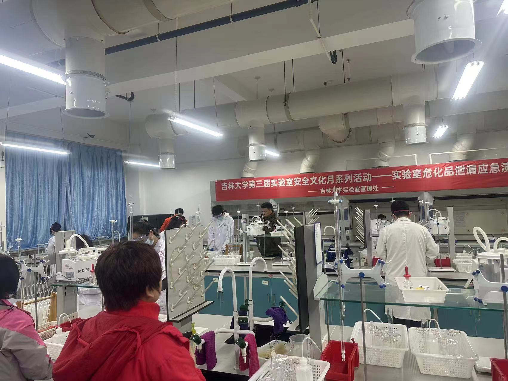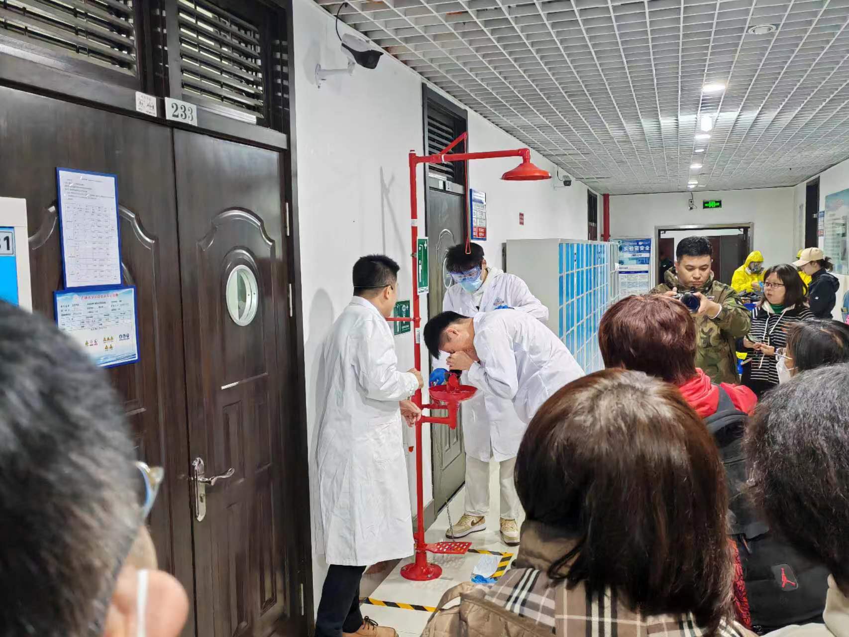 教师姜健带领学生们观摩了18日上午8点30分在李四光实验楼231实验室进行的危化品/废液泄漏应急演练。