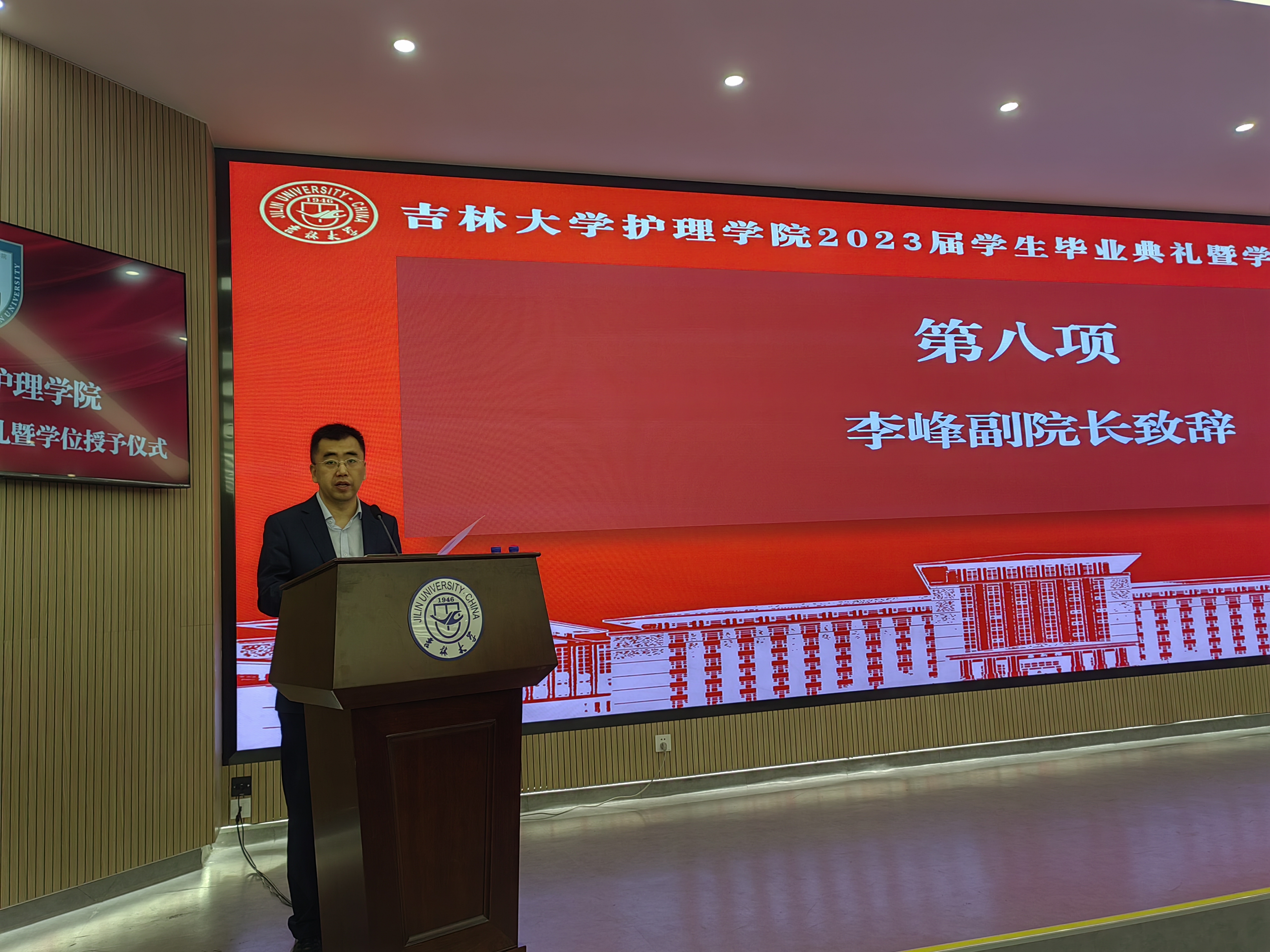 最后,副院长李峰教授致辞。他代表学院向圆满完成学业的毕业生们表示祝贺;向辛勤栽培他们的老师们和抚育他们成长的父母家人们致以崇高的敬意和诚挚的感谢;向在抗击疫情中所有冲锋在前、历经磨砺与成长的志愿者们表示肯定和赞扬。对毕业生提出几点期望。第一,希望同学们终身学习,厚积薄发,永远保持好奇心和求知欲,在不断探索中收获更多的知识和智慧。第二,希望同学们不忘初心,从容致远,牢记白求恩精神和“慎独敦行,仁爱奉献”的院训准则,成为有大爱大德大情怀的护理人和康复人。第三,希望同学们抱负远大,勇攀高峰,树立远大志向,勇敢追求目标,主动把个人发展融入国家复兴大业,争当伟大理想的追梦人。