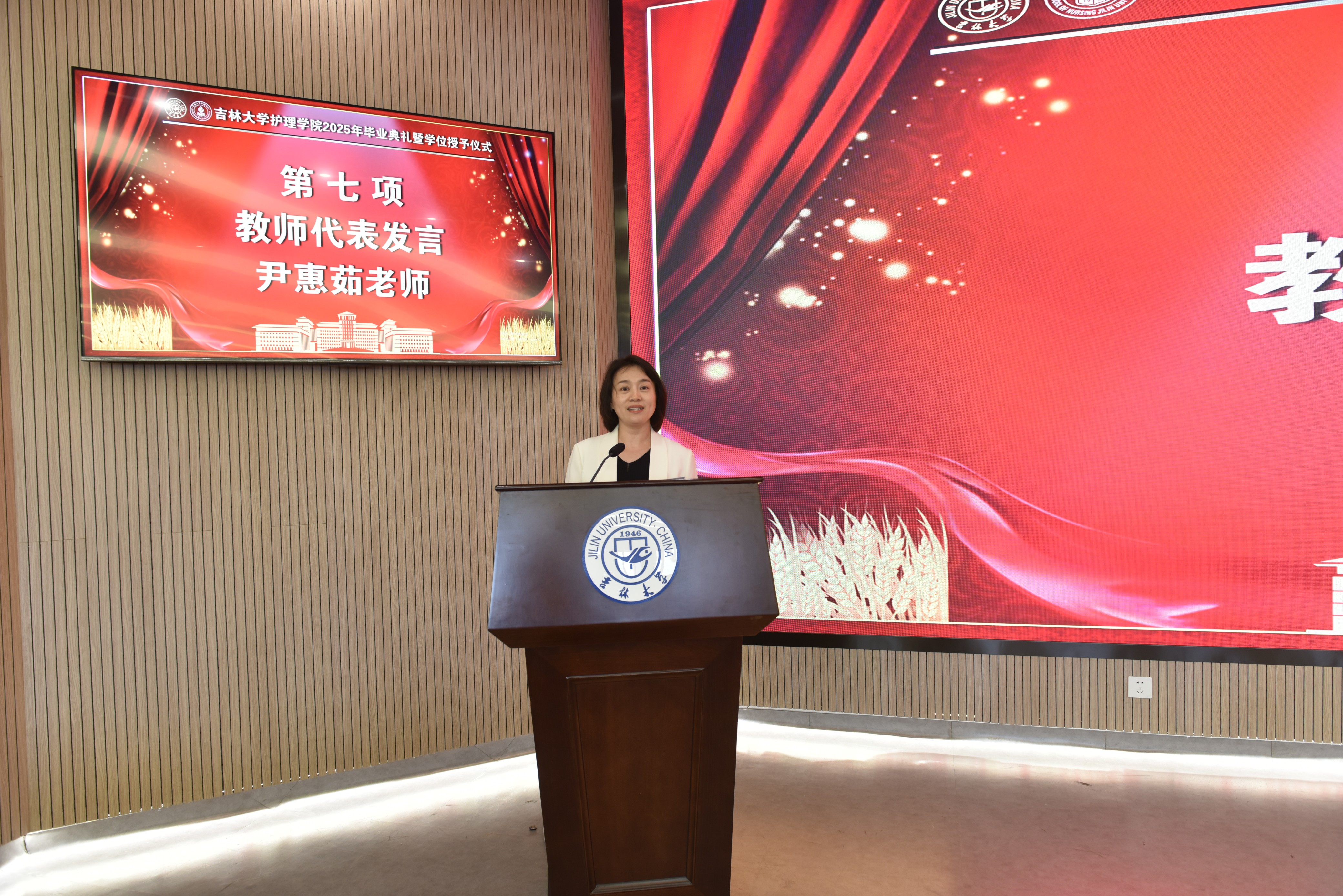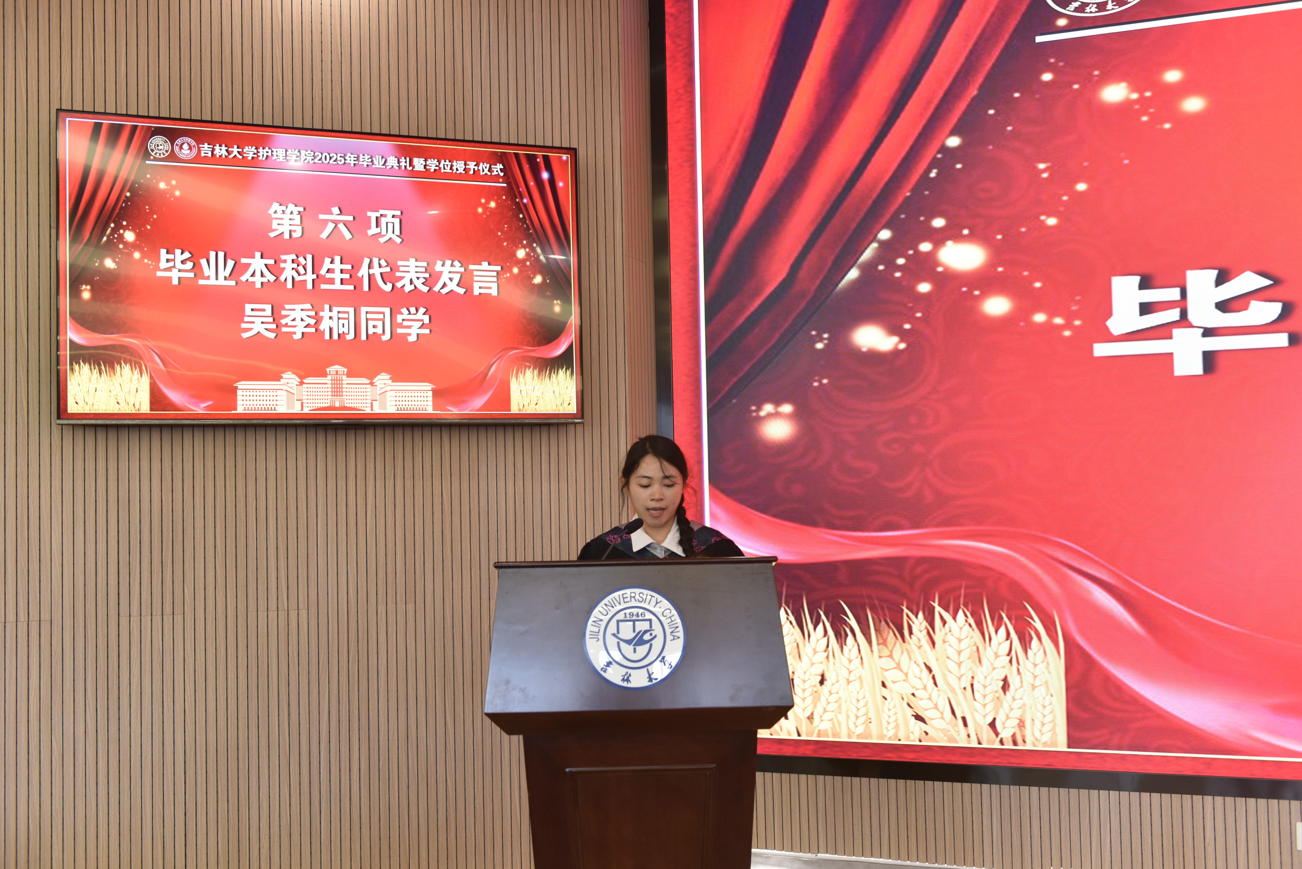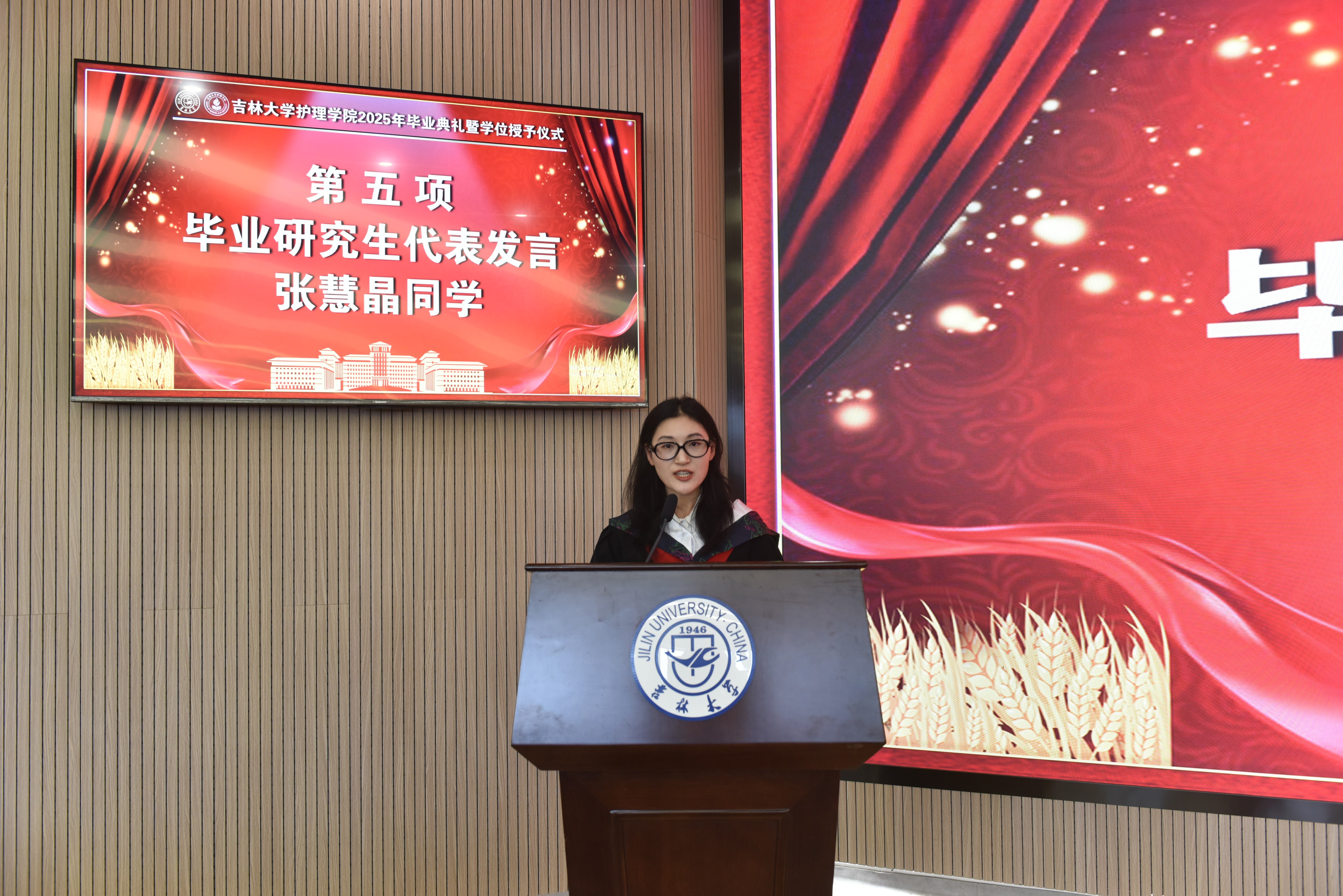 的成长历程,并表达了对全体毕业生的殷切希望和真挚祝福:一是希望同学们坚定理想信念,坚守使命初心,以奋斗之我、青春之我,担起历史赋予青年一代的使命;二是希望同学们秉承白医精神,践行医者仁心,不断用实际行动擦亮吉大护理的金字招牌;三是希望同学们矢志不渝奋斗,永葆干事恒心,以守正创新、服务大局的自觉意识实心干事,用行动诠释护理人和康复人的责任与担当。