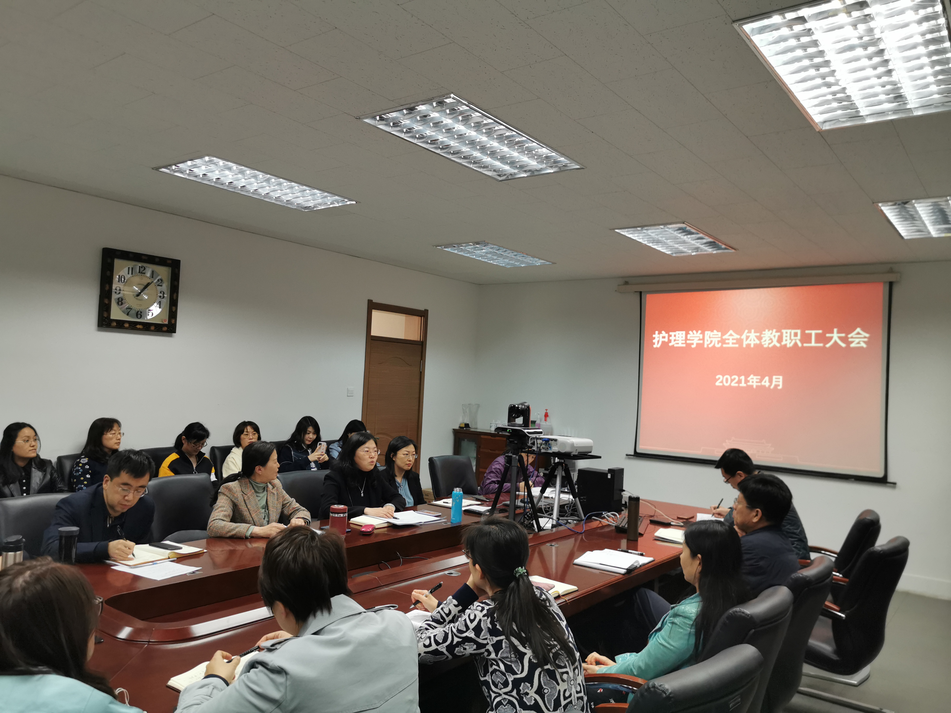 在三楼会议室召开全院教职工大会,会议由陈立院长主持。