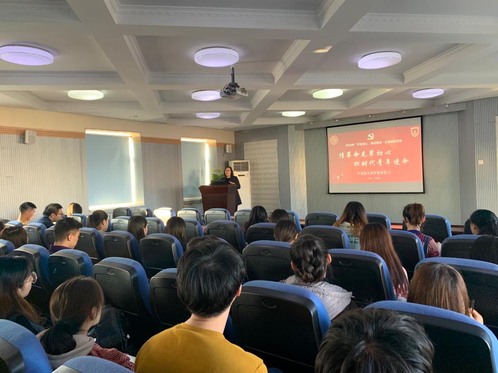 葛宗梅同志以“传革命先辈初心,担时代青年使命”为主题,通过讲述党史中的大事件和红色革命故事,讲述了革命先辈在为红色政权建立、新中国成立和社会主义建设过程中,进行了艰苦卓绝的斗争,做出了不可磨灭的贡献,让同学们深刻的认识到了红色政权的来之不易,新中国的来之不易,中国特色社会主义来之不易。她要求党员必须学习党史、新中国史,自觉接受红色传统教育,传承革命先辈遗志,把我们的国家守护好、建设好。她希望当代青年大学生特别是党员要勇担时代使命,以深厚的爱国情怀为根基、以明确的基层导向为方向、以蓬勃的创新活力为动力、以坚韧的实干作风为抓手,志存高远、脚踏实地,求实创新、励志图强,把自己的“小梦想”融入到中华民族伟大复兴的“大梦想”中,在平凡的岗位上创造不平凡的业绩。