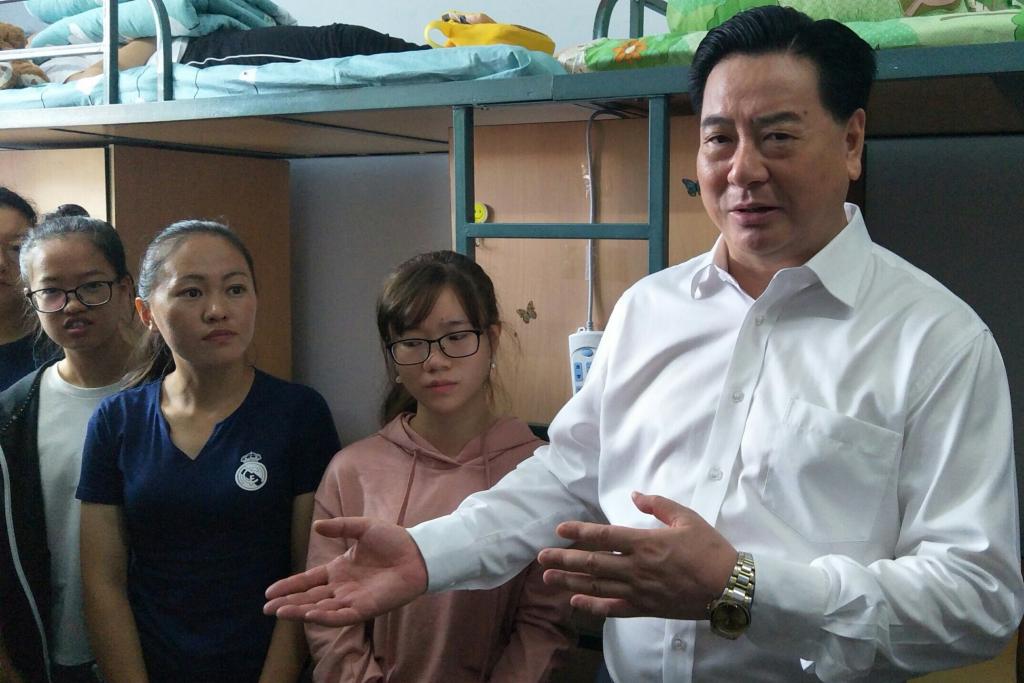 学生寝室,慰问入住公寓的新生,并与部分新生及家长亲切交谈。由于暑期宿舍翻修,部分新生宿舍收尾工作仍在继续,李校长向新生表达了关怀和歉意。他表示,学校一直致力于改善学生宿舍环境,会尽快完成收尾工作,给同学们一个安全舒适的休息和学习环境。新生与家长们为校长无微不至的关怀所感动,纷纷表示能够理解和支持学校的安排。