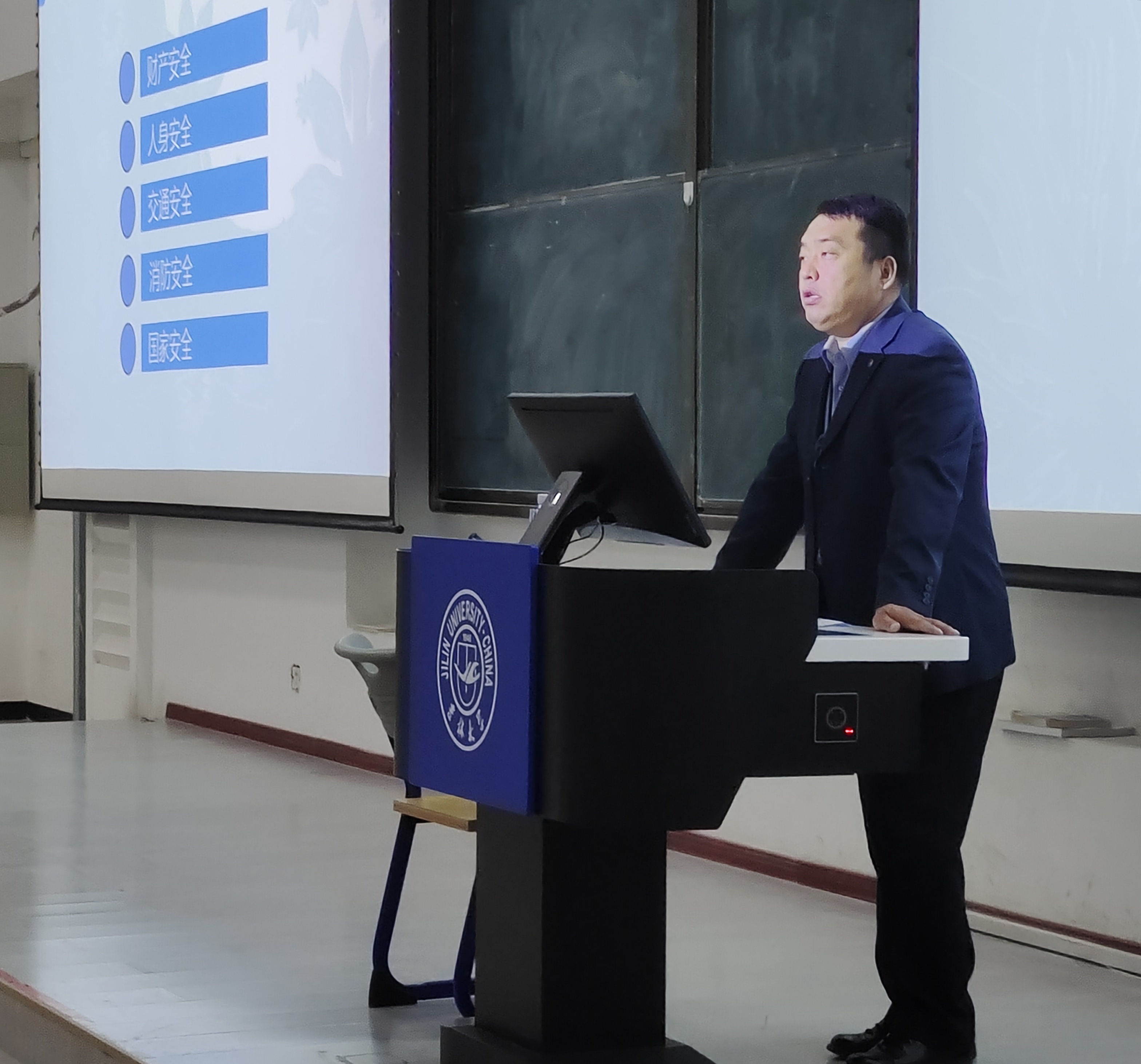全体2021级本科生于经信教学楼F区5阶教室参加我校保卫处左学成老师的安全教育讲座。