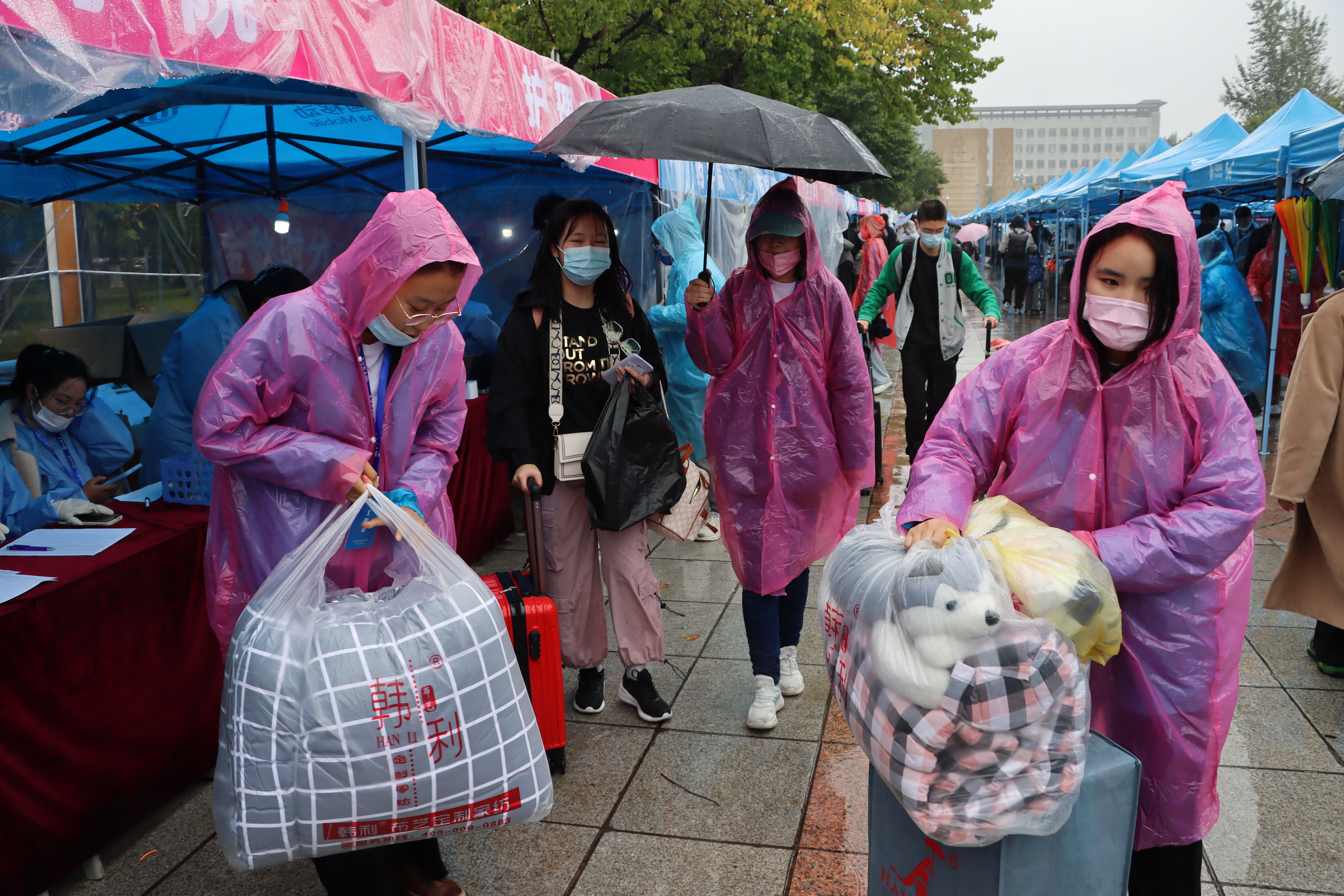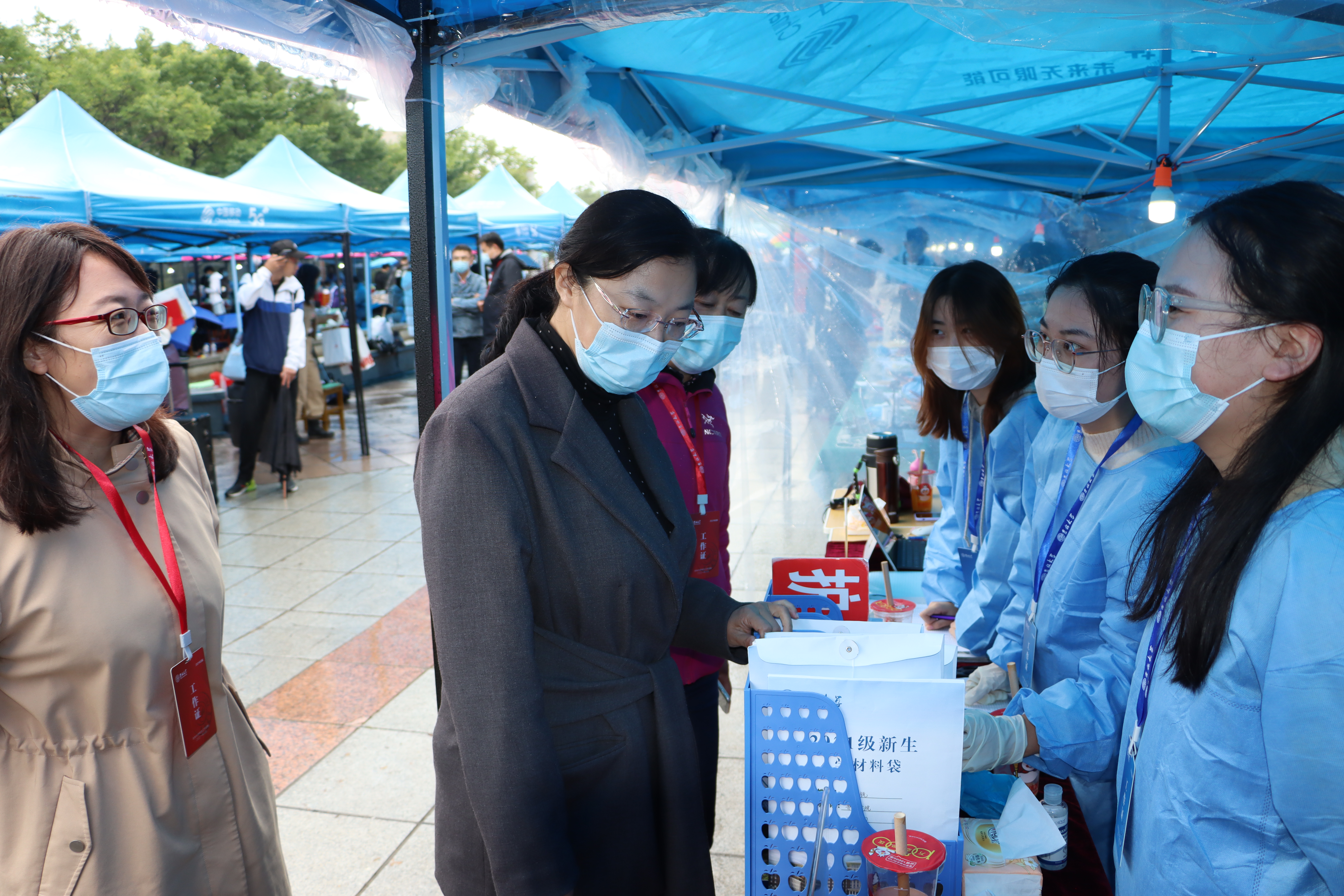 在迎新过程中,新生们井然有序地在学院迎新接待站按照报道流程依次办理报到手续,进行身份认证与领取新生材料包,在志愿者的引导和帮助下到达学生公寓。阵阵秋雨未浇灭志愿者们的热情,他们往返于校门、接待站、宿舍之间,协助新生快速完成报到、入住等工作,主动介绍中心校区各类信息,耐心解答新生疑问,帮助新生与校园美景合影,纪念同学们迈入大学校园的难忘时刻,开启全新征程。