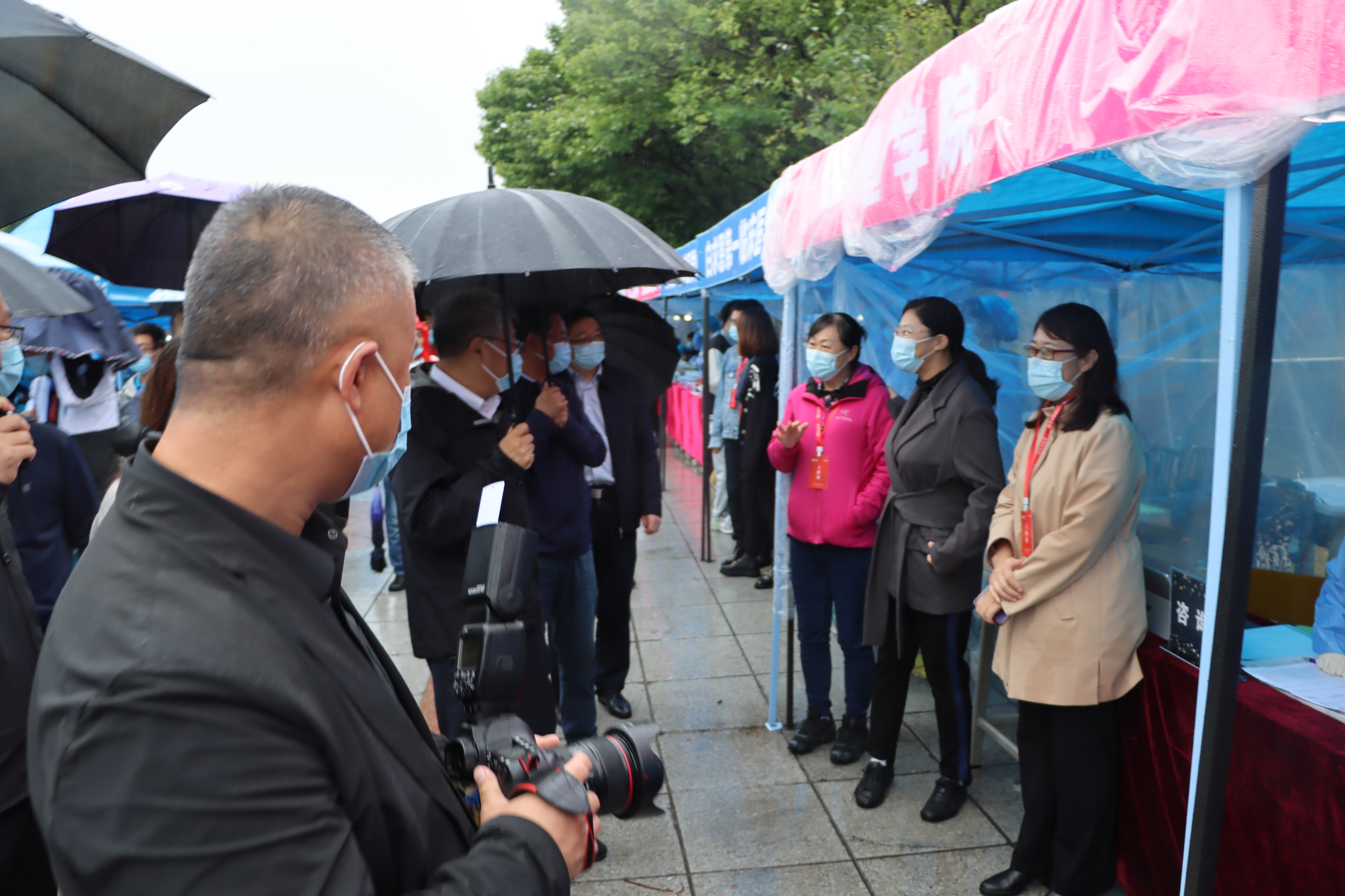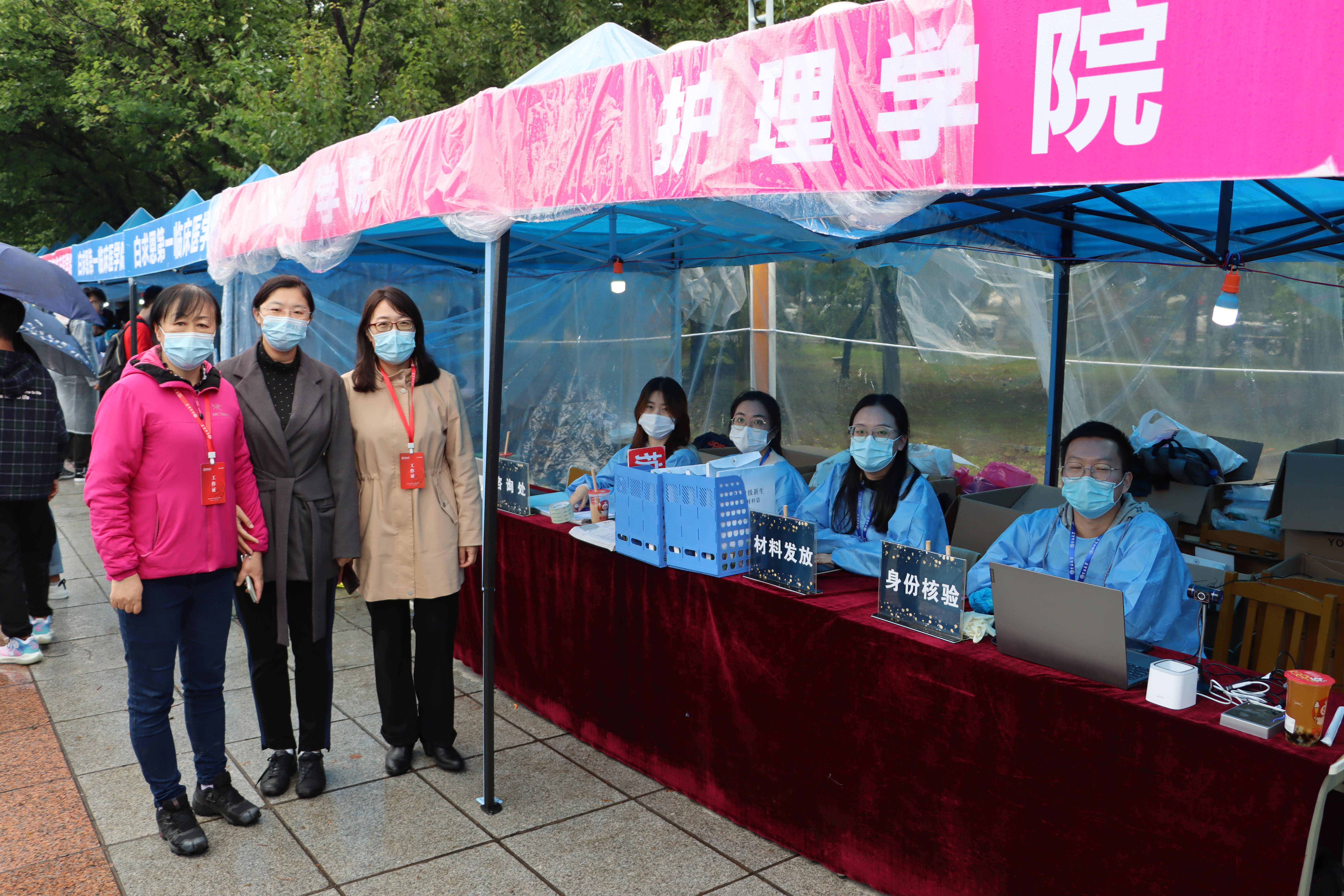 22日早5:30,学院党委副书记兼副院长、2021级新生辅导员葛宗梅,辅导员李亚琴带领迎新工作者和志愿者到达南区五月花广场,布置迎新现场,虽秋雨绵绵,但期盼与新生相见的激动之心丝毫未减。