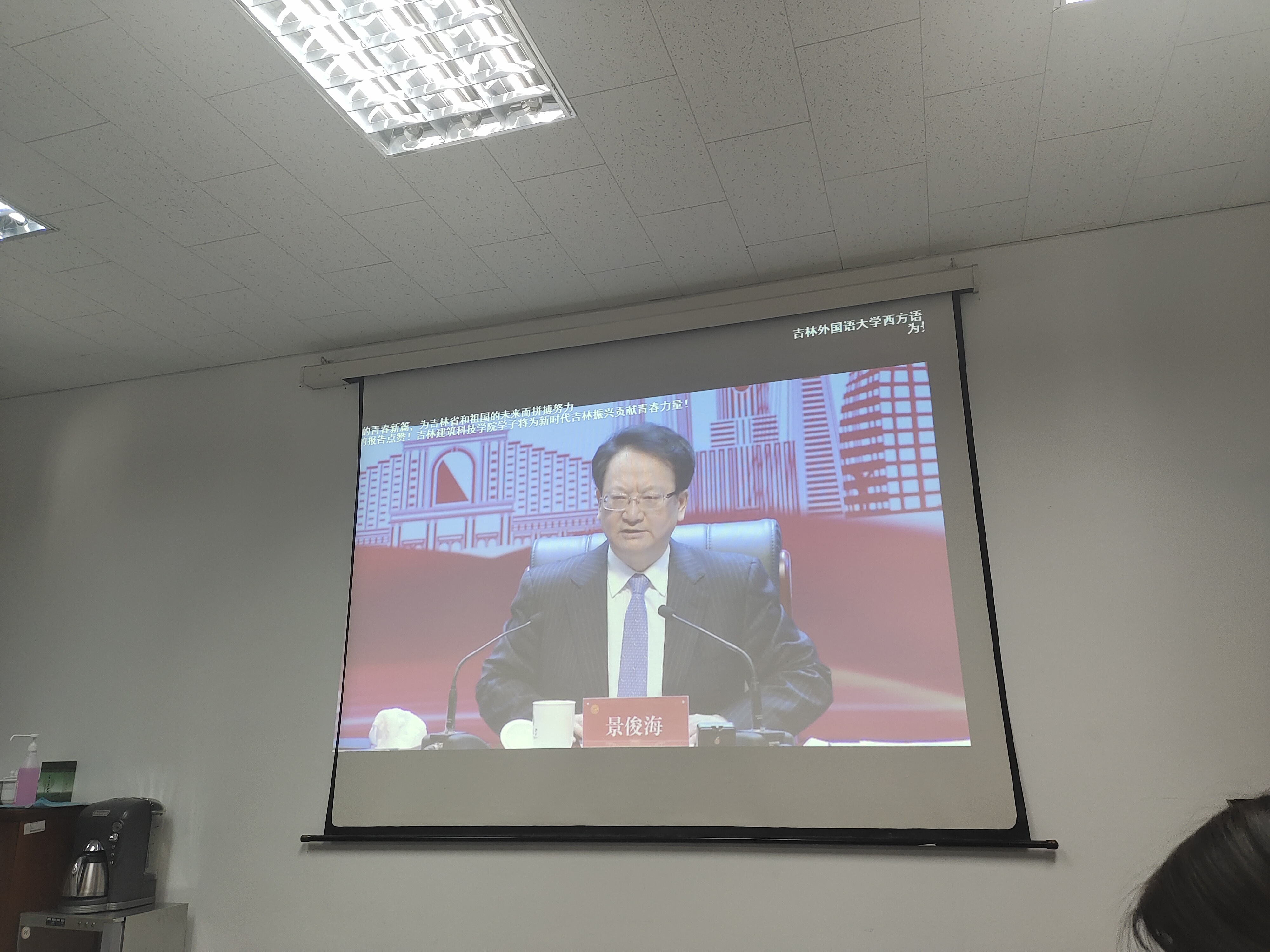 本次报告会采取线上的形式,上午9点,与会老师和同学们一同在学院三楼会议室的分会场观看报告会的直播视频。报告会上,吉林省党委书记景俊海书记首先就习近平总书记关于振兴吉林有关精神进行了报告。景书记强调,全省人民要深入贯彻党中央决策部署,不断开创吉林各项事业发展新局面,在新时代吉林振兴中实现新突破、创造新业绩。作为新时代大学生,要勇于担当,勇于奋斗,勤奋学习,在新起点面前做具有责任意识和创新精神的建设者。