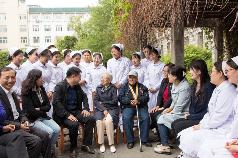 两位老党员和中青年党员们促膝长谈,氛围温馨融洽。牛慧英同志自1945年初正式参加工作,在抗战期间曾跟随国际共产主义战士柯棣华同志辗转各地学习工作,作为亲历者,她深情回忆了往昔的峥嵘岁月,生动再现老白医人的奋斗历程,深深感慨党领导人民创造幸福生活的伟大功绩。张丽华同志是原白求恩医科大学医务处护理部主任,曾主管全校的护理工作,她热爱护理事业、勤恳好学、积极上进,从事临床护理工作四十余年,用一生践行着护理事业。