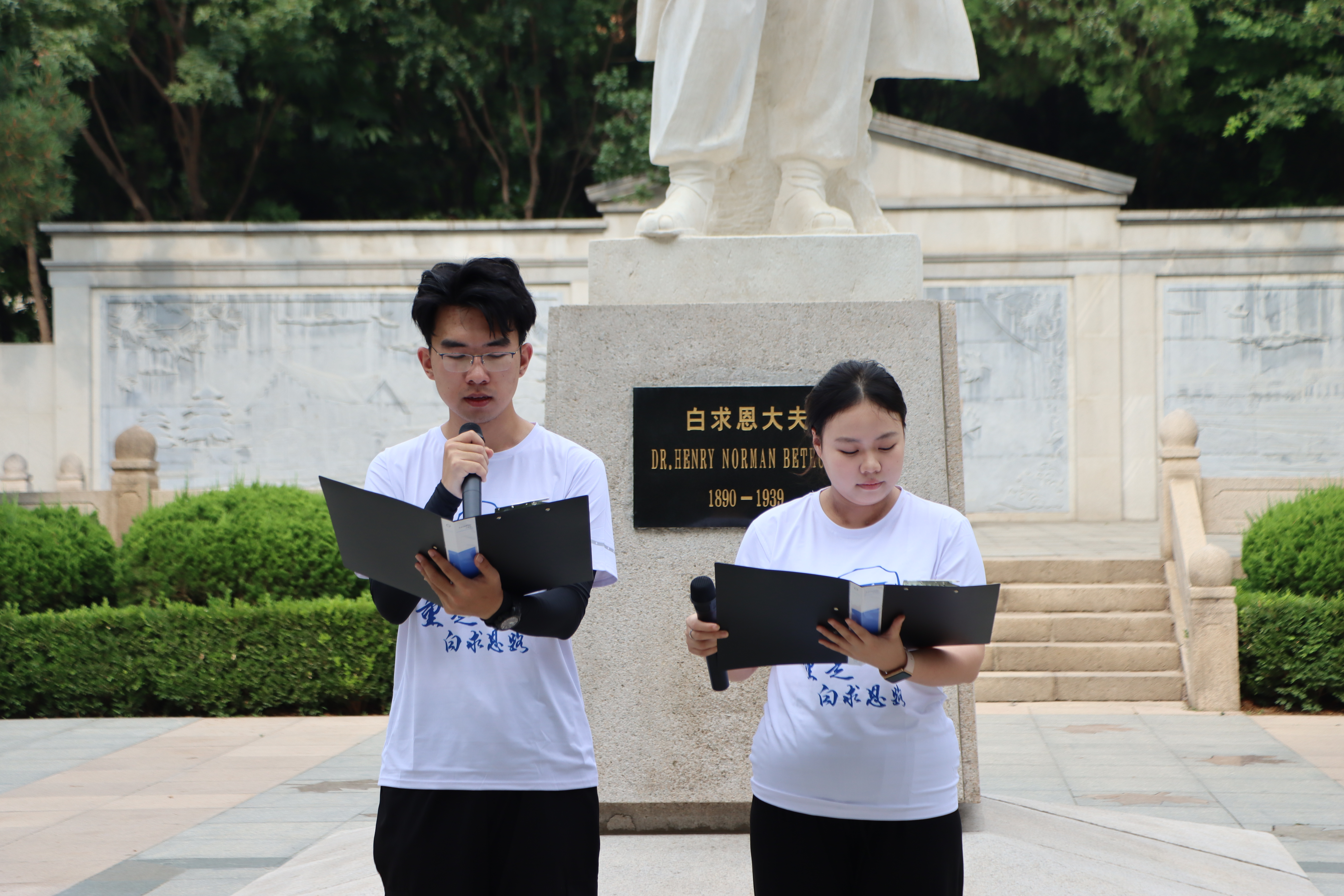 与基础医学院学生代表共同朗诵《纪念白求恩》,在声声朗诵中抒发对白求恩同志的敬佩与怀念,表达弘扬和践行白求恩精神的决心。随后,学生代表向白求恩墓敬献花篮,队员们依次向白求恩墓献花。公共卫生学院学生代表发言,表明作为一名医学生,要坚定信念信心,传承发扬国际主义精神。巴卡漫画